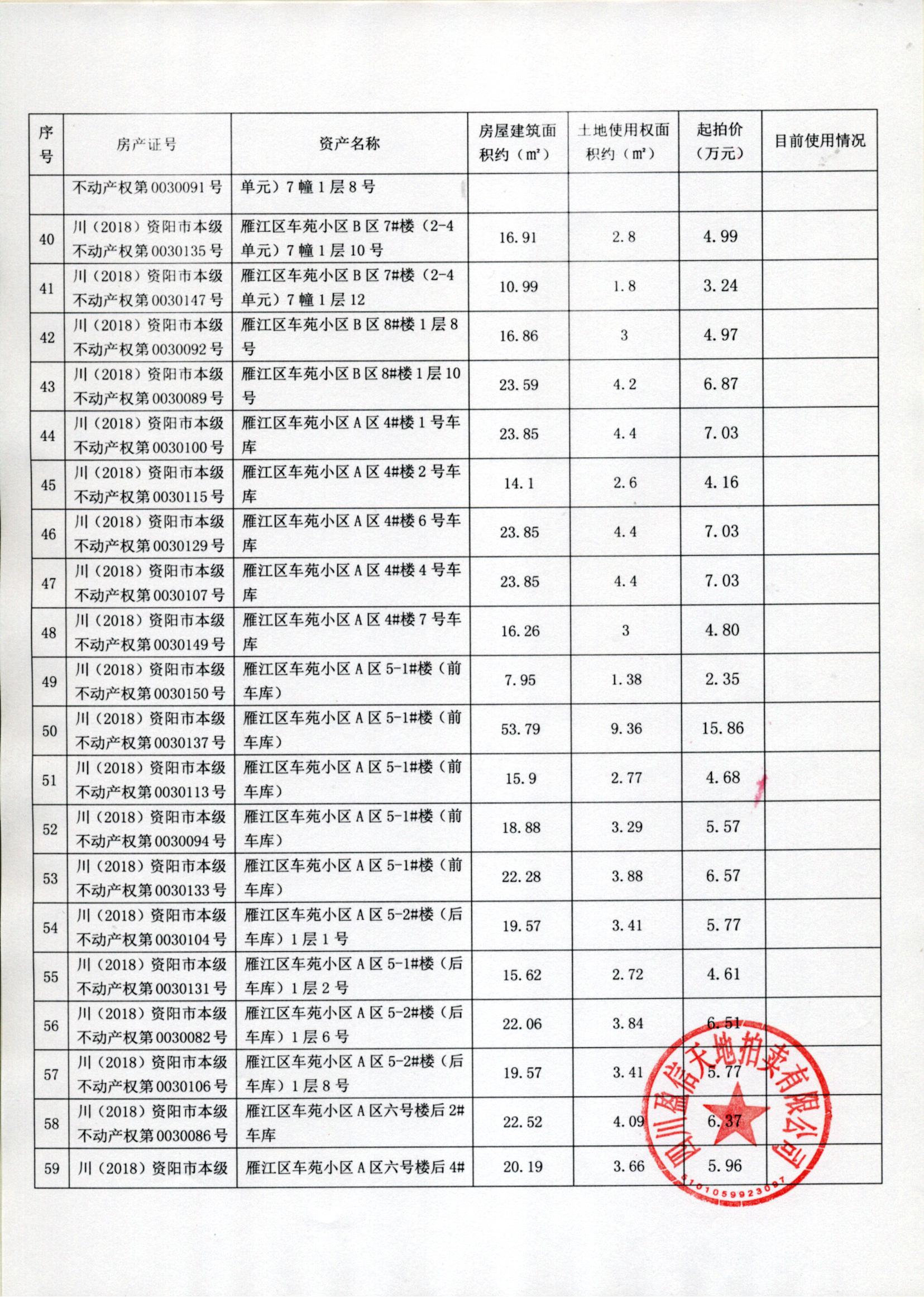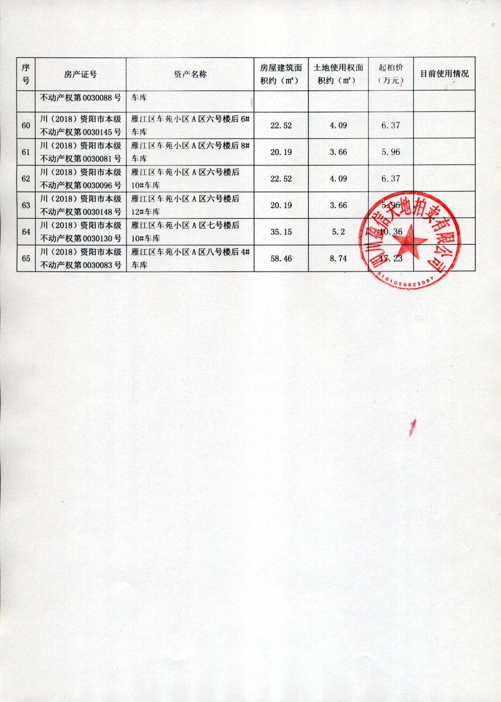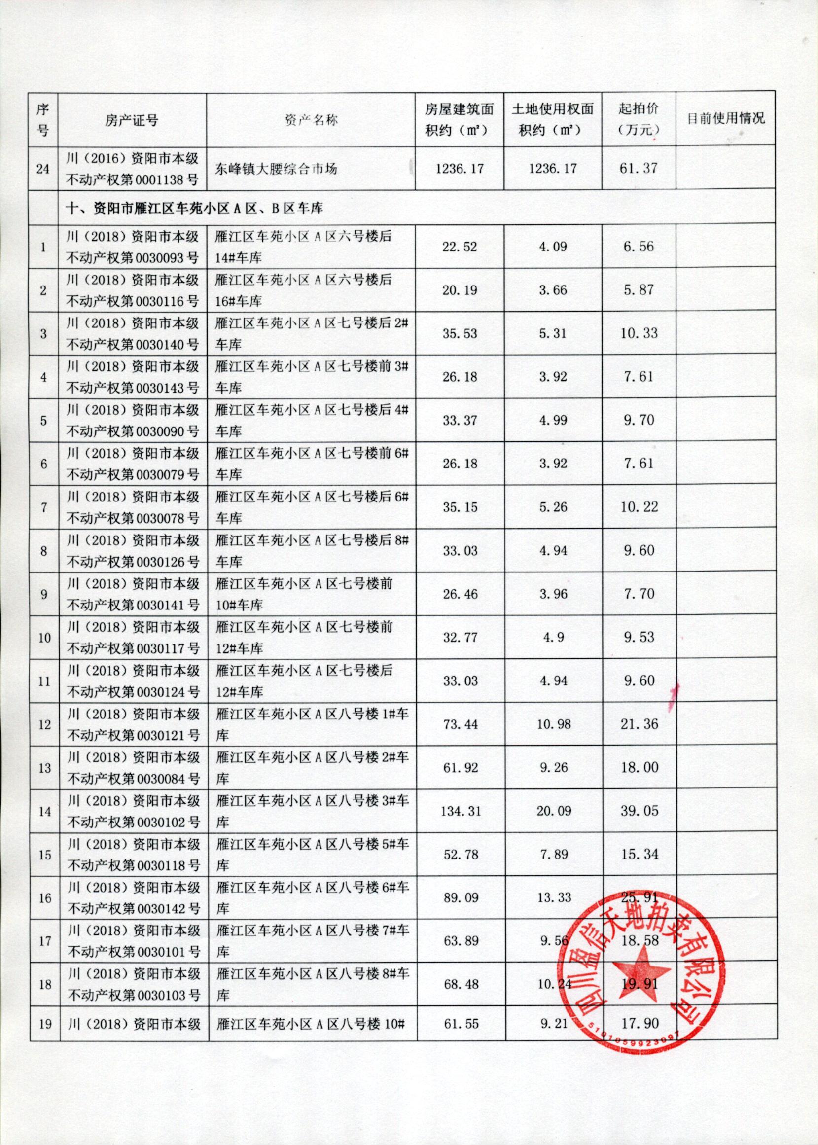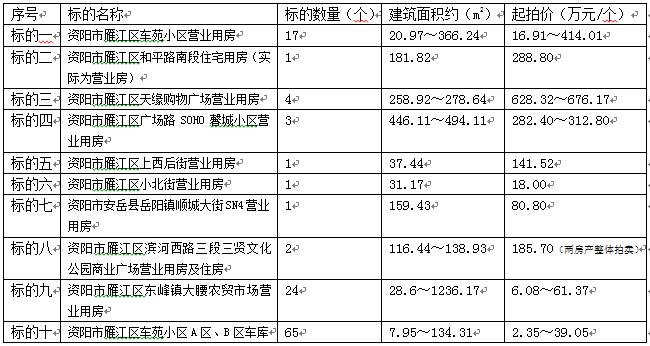 二、競買資格:標的一至標的九中的各標的:中華人民共和國境內外的法人、自然人和其他組織除法律另有規定外均可申請參加競買;標的十的各標的:僅限資陽市雁江區車苑小區的業主本人(單位)競買。