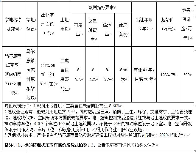 經(jīng)馬爾康市人民政府批準,受馬爾康市自然資源局委托,定于 2020年12月18日10:00在阿壩州公共資源交易中心四樓產(chǎn)權(quán)交易大廳(汶川縣威州鎮(zhèn)東街246號),對馬爾康市卓克基-阿底組團B11-2地塊國有建設用地使用權(quán)依法進行公開拍賣,現(xiàn)將有關事項公告如下: