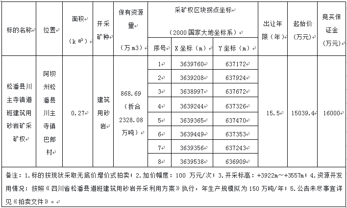 經松潘縣人民政府批準,受松潘縣自然資源局委托,定于2024年3月15日10:00在阿壩州公共資源交易中心四樓產權交易大廳(汶川縣威州鎮(zhèn)東街246號),對松潘縣川主寺鎮(zhèn)道班建筑用砂巖礦采礦權出讓依法進行公開拍賣,現將有關事項公告如下: