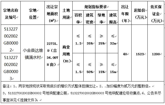 經小金縣人民政府批準,受小金縣自然資源局委托,對小金縣達維鎮滴水村“513227002002GB00002”號、“513227002002GB00003”號(木爾寨溝口)地塊依法進行公開掛牌出讓。現將有關事項公告如下: