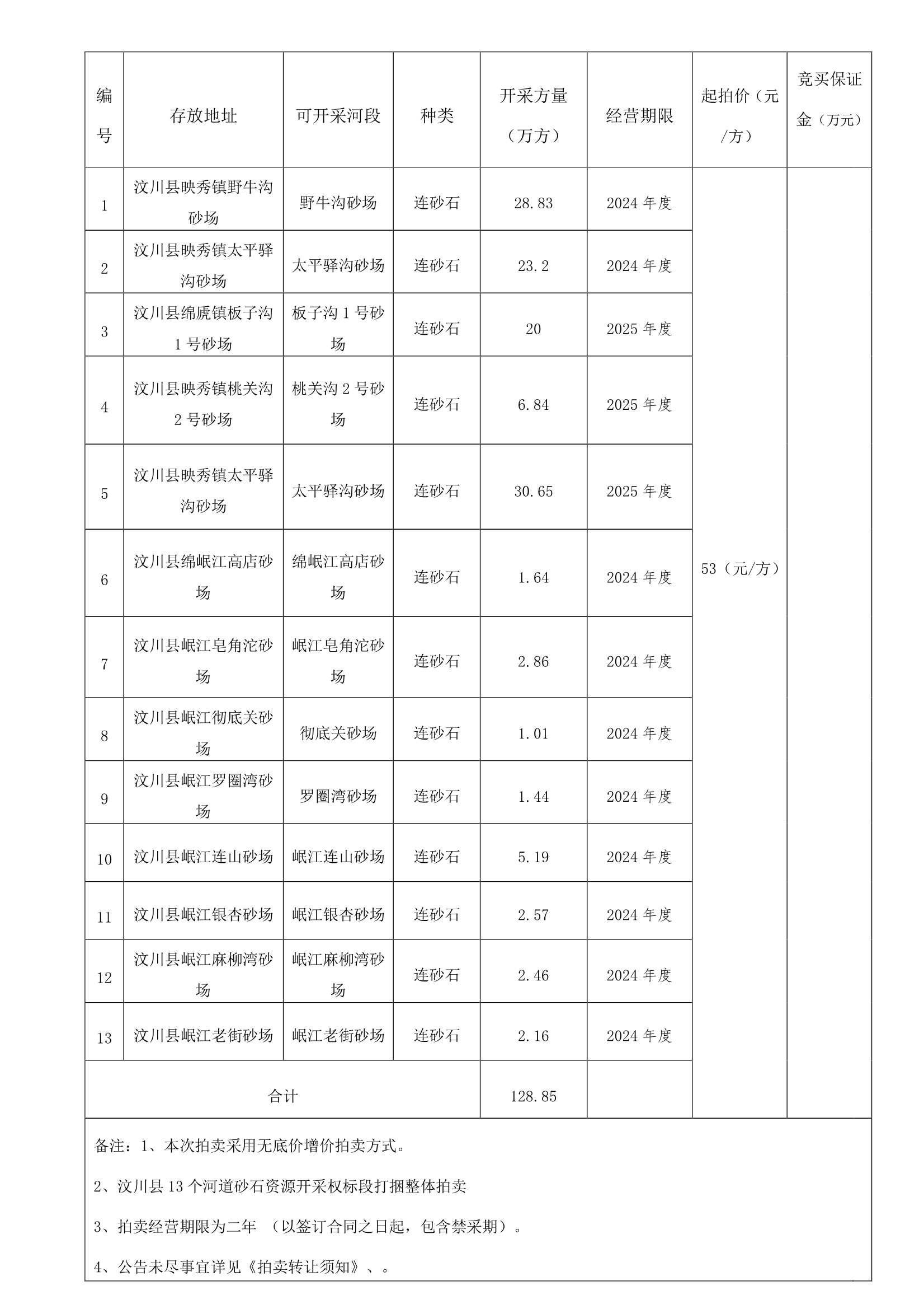 汶川縣水務局委托,定于2024年10月29日上午10:00時在阿壩州公共資源交易中心四樓產權交易大廳(汶川縣威州鎮東街246號)對汶川縣河道砂石資源開采權拍賣項目(2024-2025年)依法進行整體公開拍賣,現將有關事項公告如下: