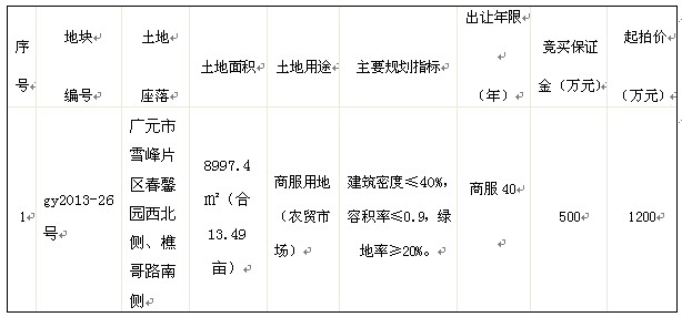 根據(jù)《土地管理法》、《城市房地產(chǎn)管理法》、國土資源部39號(hào)令的規(guī)定,報(bào)經(jīng)四川省廣元市人民政府批準(zhǔn),廣元市國土資源局決定拍賣出讓以下一宗國有建設(shè)用地使用權(quán)。